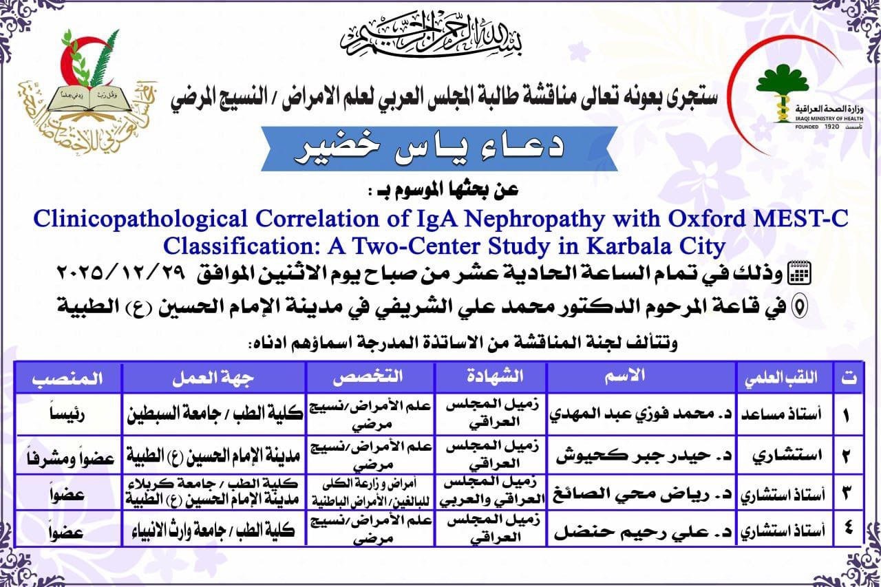 أقيمت على قاعة المرحوم الدكتور محمد علي الشريفي في مدينة الإمام الحسين ( ع ) الطبية ,اليوم الاثنين 29/12/2025 مناقشة البحث المُقدم من قبل
