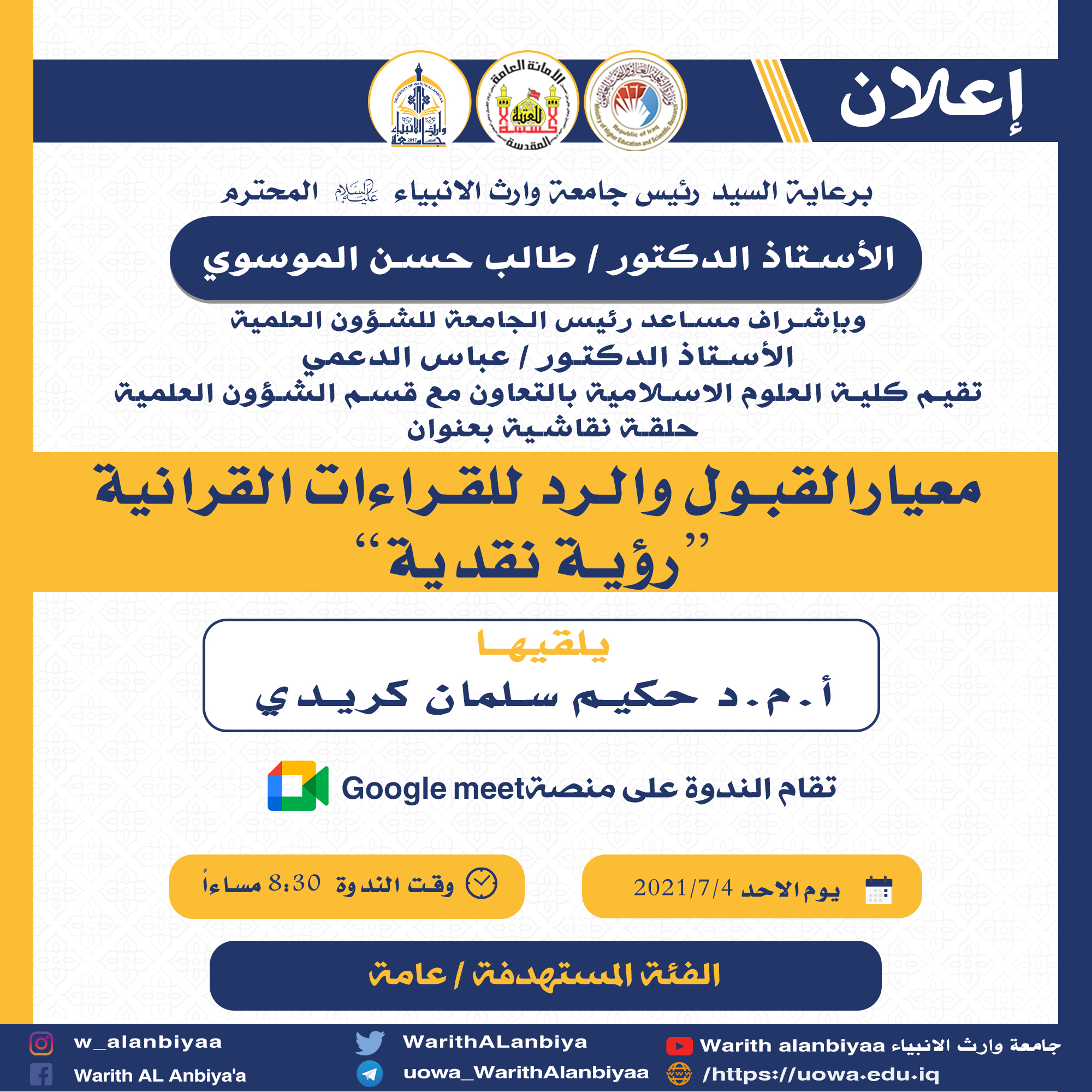 http://meet.google.com/fcp-tngi-txc  رابط الدخول الحلقة النقاشية معيار القبول والرد للقراءات القرآنية. رؤية نقدية والتي يحاضر فيها أ.م.د حكيم السلطاني