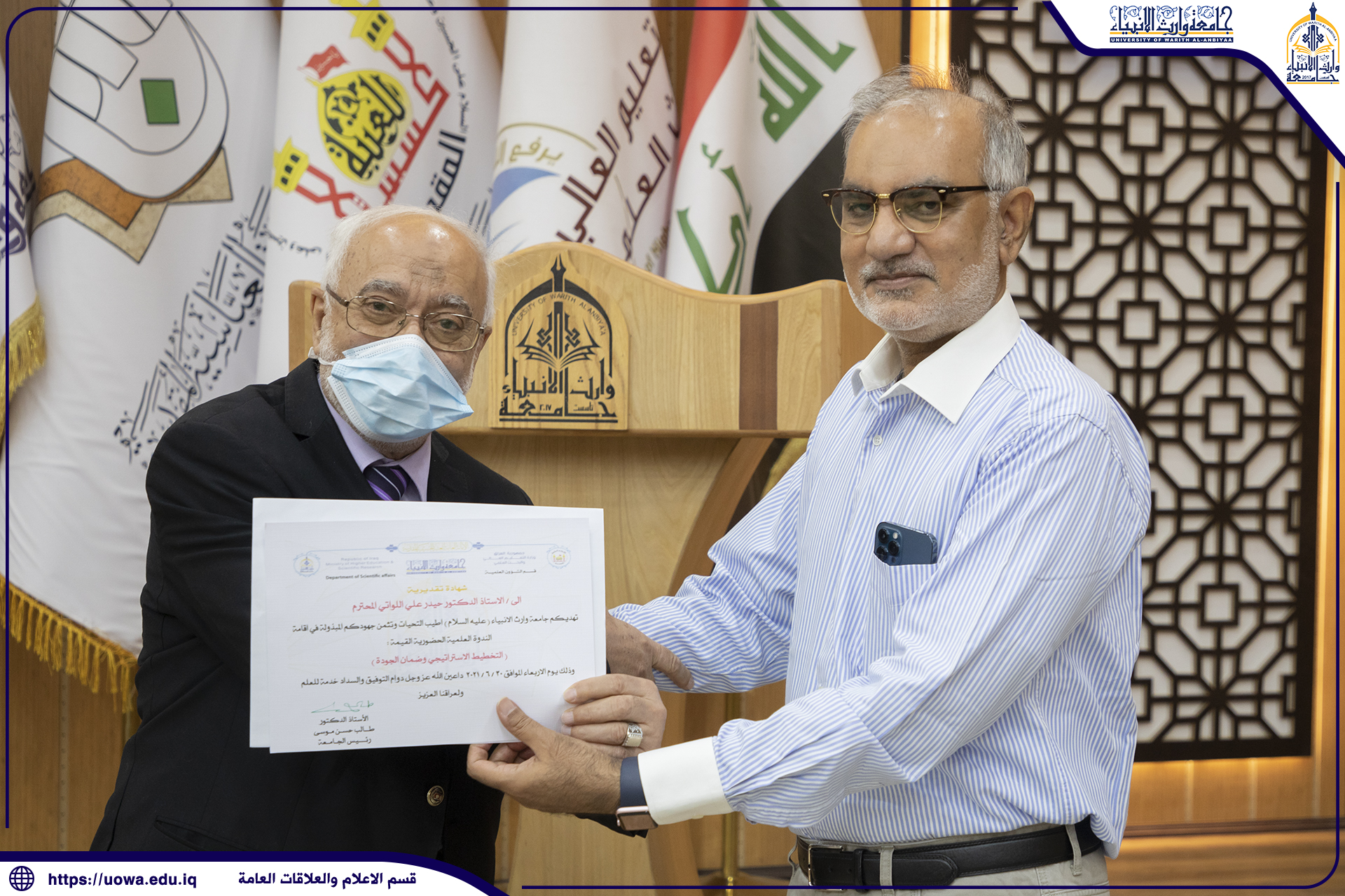 ( شهادة مشاركة التعليم المدمج وطرق تطبيقه على منصة التعليم الالكتروني في جامعة وارث الانبياء ) + ( الامر الجامعي ) + ( شهادة تقديرية للاستاذ المحاضر )