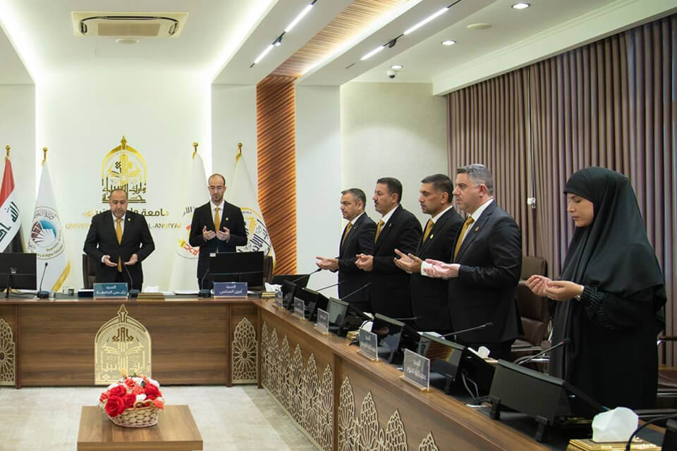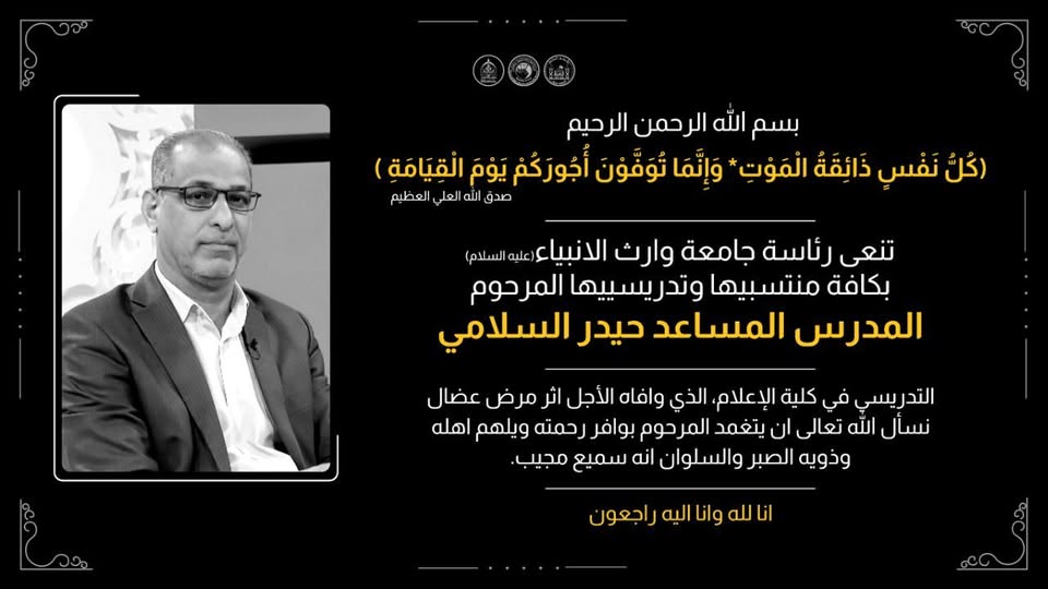 مجلس جامعة وارث الأنبياء (عليه السلام) يقف وقفة حداد وقراءة سورة الفاتحة على روح المرحوم المدرس المساعد حيدر السلامي، التدريسي في كلية الإعلام، الذي وافاه الأجل إثر مرضٍ عضال.