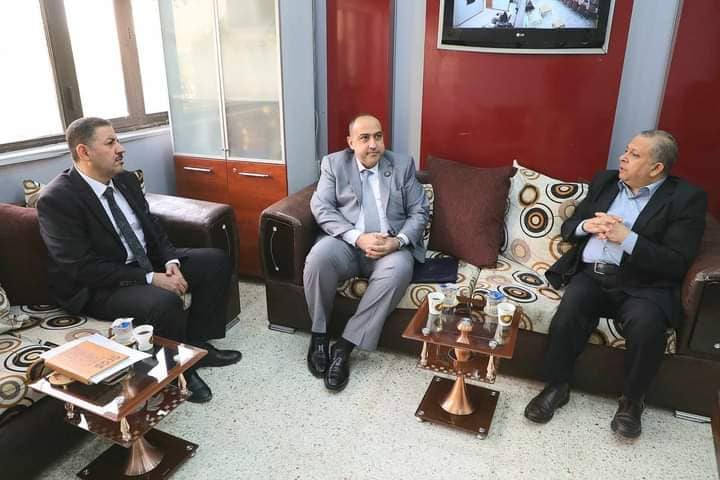 Professor Dr. Ibrahim Al-Hayawi, accompanied by the Dean of the College of Medicine, Professor Dr. Ali Abdul Saadoun, visited the Department of Health in Karbala and met with its General Director, Dr. Sabah Al-Mousawi. During the meeting, both parties discussed various scientific, research, and academic matters of mutual interest.