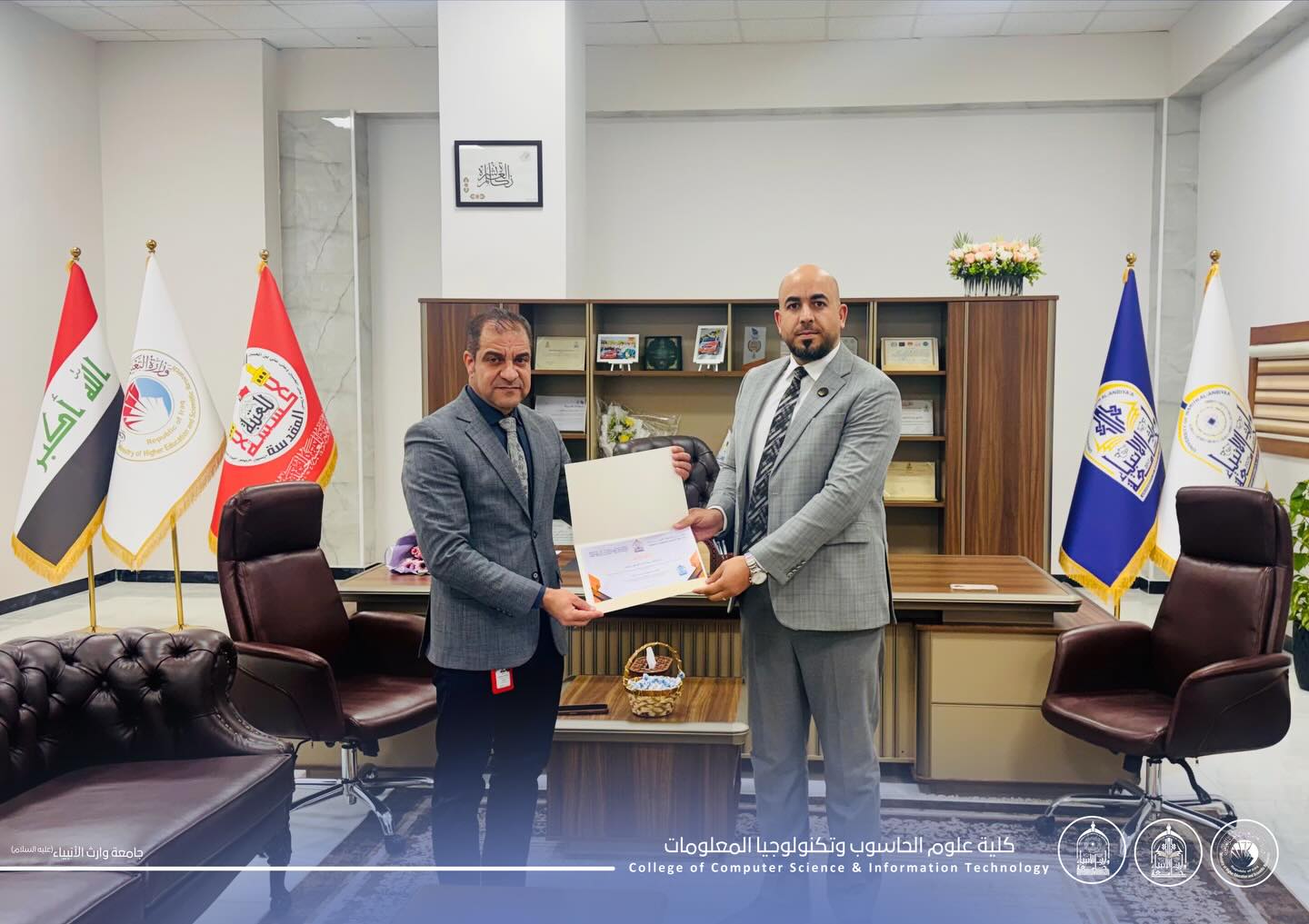 The College of Science was honored by a blessed visit from the Assistant President of the University of Warith Al-Anbiyaa (peace be upon him), Professor Dr. Noufal Al-Aaraji. He was received by the Dean of the College, Assistant Professor Dr. Shaimaa Hussein Noufal, and the Head of the Information Technology Department, Assistant Professor Dr. Haider Al-Ghanimi.