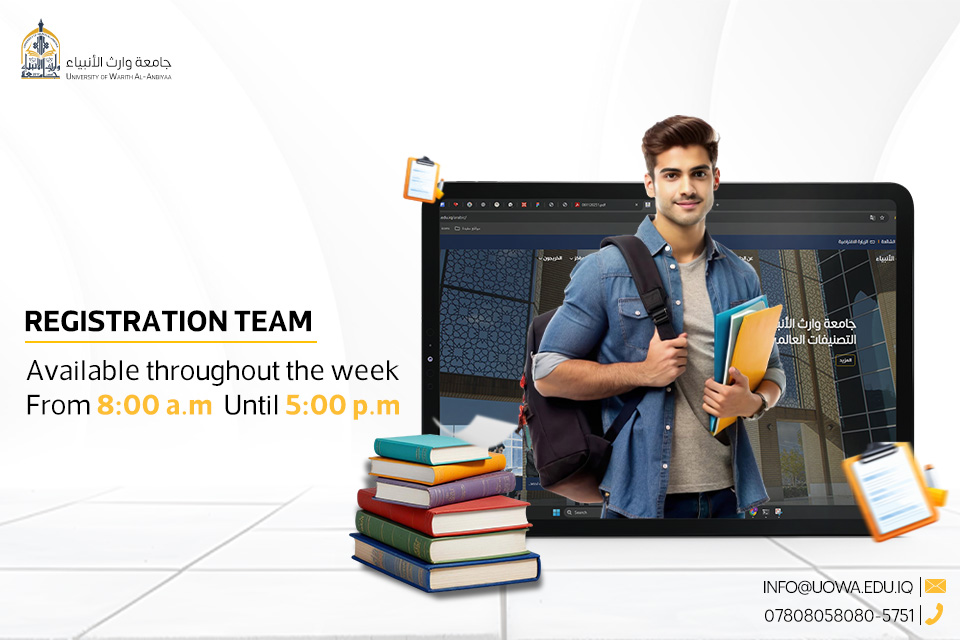 📍 The University of Warith Al-Anbiyaa registration team is available daily from 8:00 AM to 5:00 PM to assist you in completing the current steps and to answer any questions regarding the application process, colleges, and departments.
